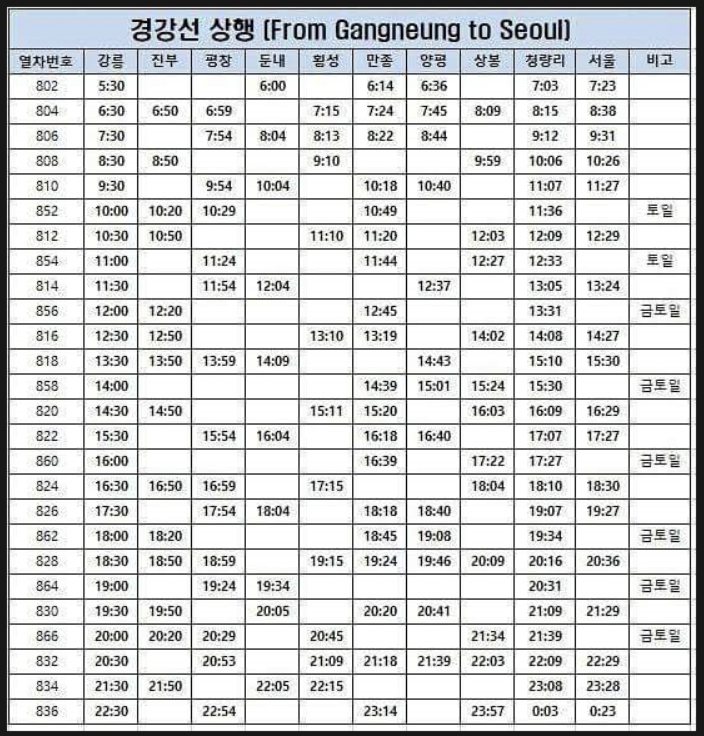 🕒 경강선 시간표: 서울 → 강릉